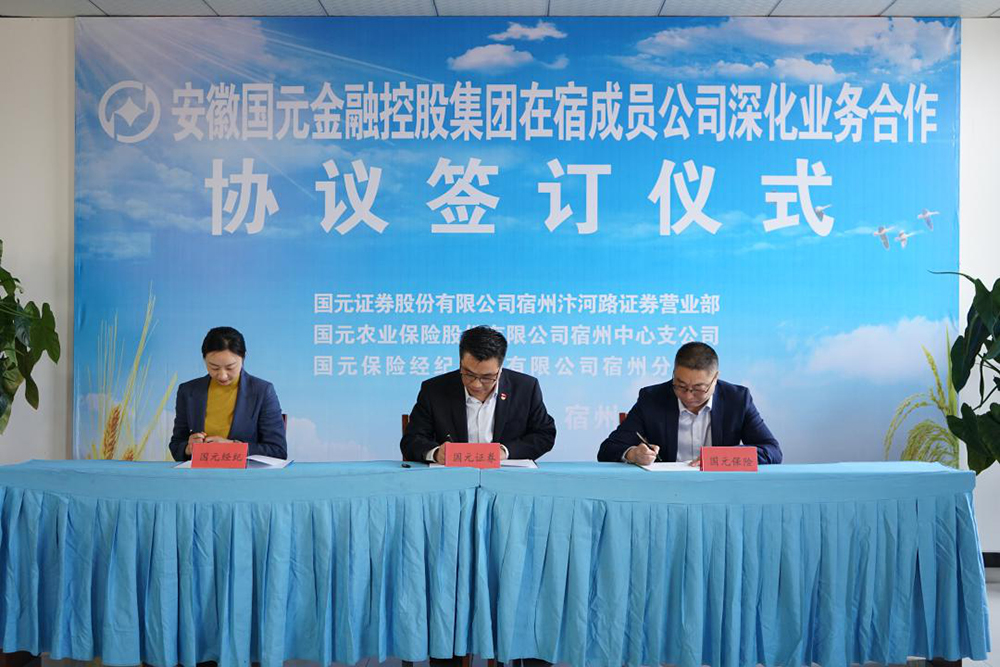 4月28日上午,安徽國元金控集團在宿成員公司國元保險宿州中支、國元證券宿州汴河路營業部、國元保險經紀宿州分公司深化業務合作協議簽訂儀式正式舉行。國元保險宿州中支負責人楊士柱、國元證券宿州汴河路營業部負責人呂飛、國元保險經紀宿州分公司負責人李鳳至作為三家公司簽約代表,共同簽署合作協議。
